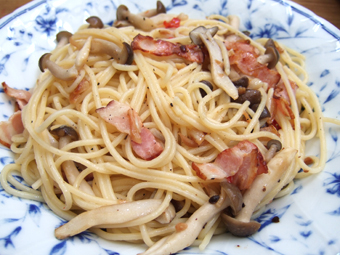 にんにくの香りが立ってきたら、ベーコン、唐辛子、しめじを入れて炒める。
