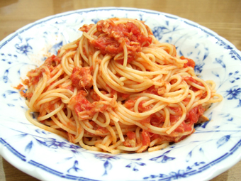 茹で上がったパスタを入れて、かるく塩コショウをし、ソースと絡める。