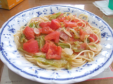 コンソメ味のスープとトマトがうまいスープパスタです。